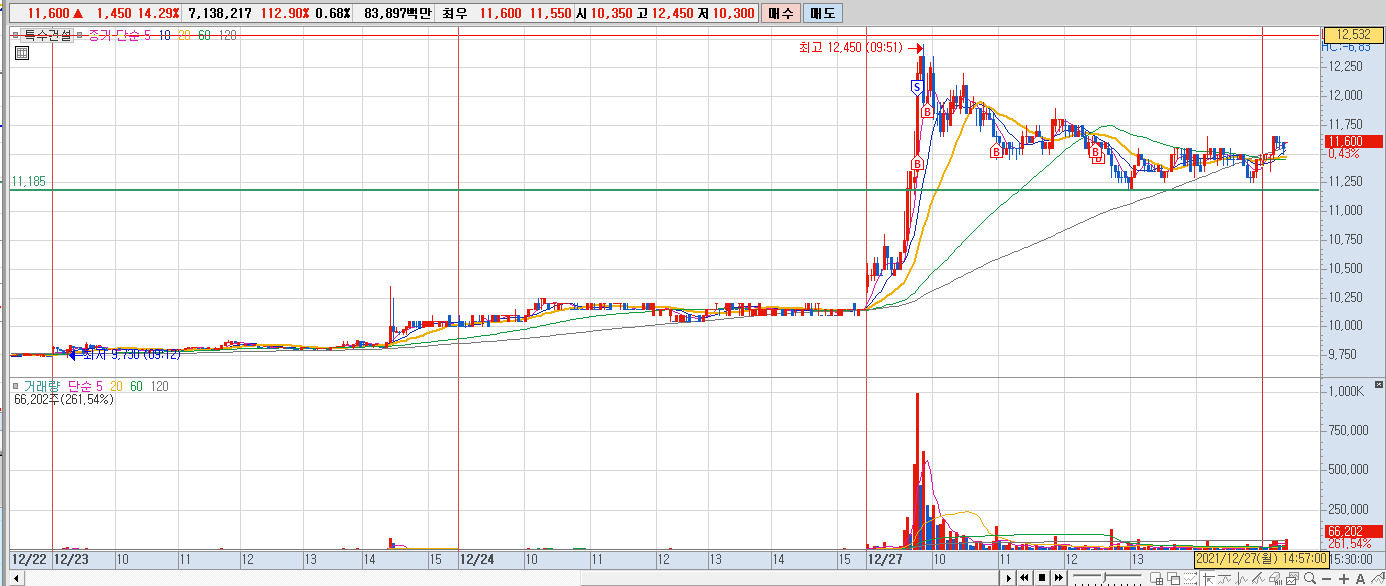 예전 매매때 좋았던 기억이 있는 종목이어서인지(확인해봤다. 예전 7월에 수익거둔 기억이 있다. 흔치않은 수익경험이라 홀렸나보다) 특수건설 짧게 수익내고 나와서 분봉상 올라가는게 더 탄탄하게 올라가는것처럼 보여서 매수했다가 반절했다. 흔치않다. 내가 내려감에 따라 비중을 절반 줄였다. 그러면 타 종목에서는 그리도 잘 못하던걸 이번에는 어찌 하게 되었는가. 반복된 학습으로 인해 내가 좀 나아졌을수도 있고, 아니면 그만큼이나 이 종목 왜 샀는지 몰라서 불안해서 도망나온것인것 같기도 하다. 어쨌든 절반 손절해서 특수건설에서 짧게 먹은 수익폭 날렸다.