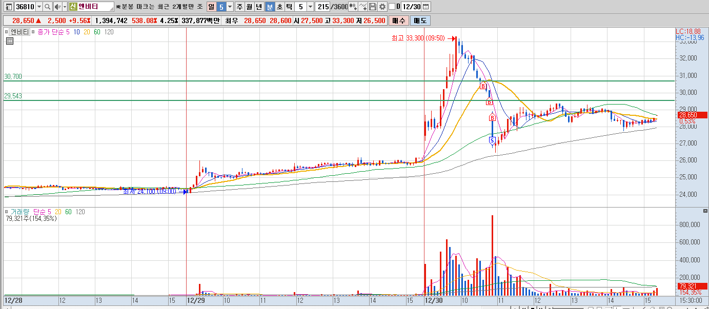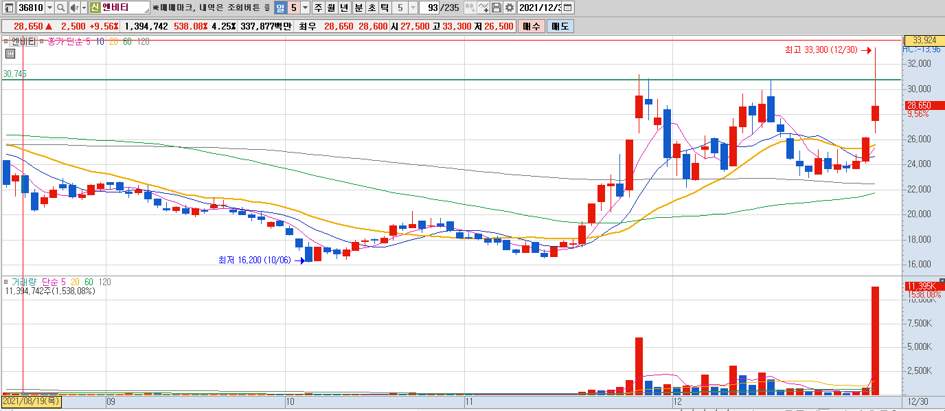 한종목이 거래대금 2000억 넘게 터트리면서 있길래 매수했던게 엔비티이다.